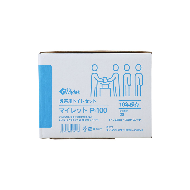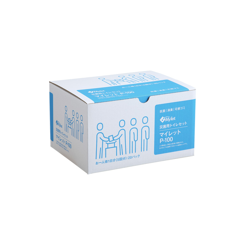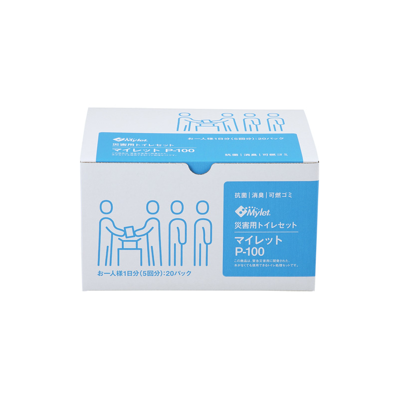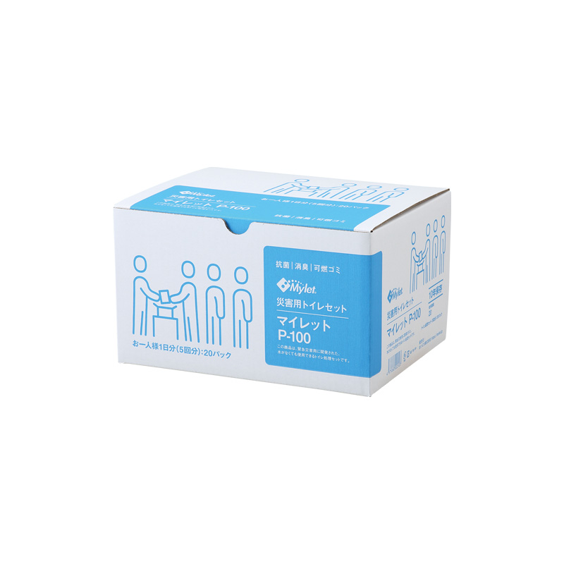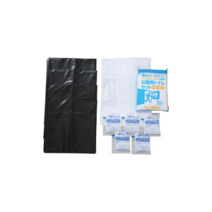 P-100 商品内容 ・5回分トイレ処理セット:20パック ・保存期間:製造から約10年間(箱側面に記載) 5回分トイレ処理セット(1パック) 内容とサイズ重量 ・抗菌性凝固剤(7g):5袋 ・排便袋(PE製黒):5袋 ・持ち運び袋(PE製白):2袋 ・サイズ:約W95×D20×H140mm ・重量:約120g |